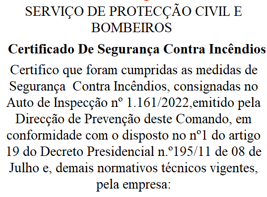 A Tecnifogo é uma empresa de direito Angolano desde 2015, líder em equipamentos de segurança contra incêndio. Oferecemos aos nossos clientes uma ampla variedade de produtos e serviços, tais como: extintores de incêndio, sistemas de detecção de incêndio, sistemas de extinção automática de incêndio, EPI´s, planos e plantas de emergência, formação de brigada contra incêndio, atendimento pré-hospitalar e matérias perigosas. Além disso, oferecemos serviços de instalação e manutenção de camaras de vídeo vigilância e cerca eléctrica. Garantimos que os clientes tenham acesso a equipamentos de qualidade.